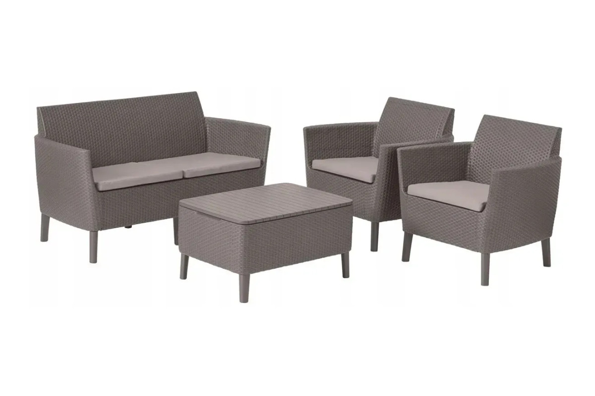 Комплект меблів Salemo з двомісним диваном Елегантний стильний комплект меблів подарує зручність і комфорт. Завдяки сучасному дизайну скандинавського стилю Salemo з двомісним диваном впишеться в інтер'єр тераси або веранди. Набір складається з 2-х місцевого дивана, двох зручних крісел і столика. Столик має додатковою функцією - зберігання, під кришкою можна помістити додаткові подушки, пледи, посуд. На дивані і кріслах передбачені м'які подушки. Текстура поверхні нагадує переплетення натурального ротанга. Меблі не вимагає особливого догляду, хіба що легке прибирання від пилу.