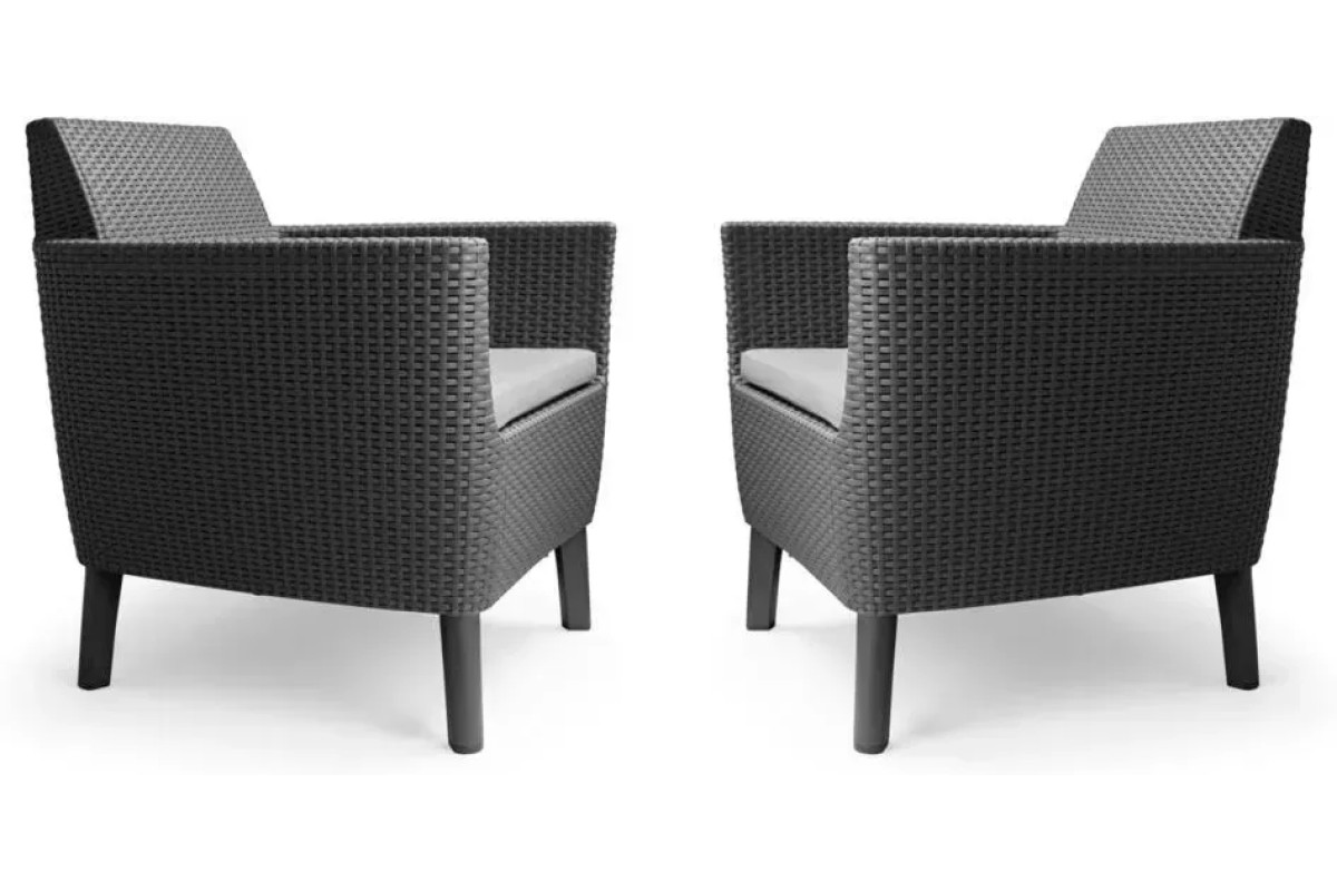 Salemo Duo – сучасний комплект садових меблів, що складається з двох просторих крісел із подушками. Завдяки обтічній формі та фактурі, яка імітує натуральний ротанг, крісла виглядають стильно та гармонійно поєднуються з іншими меблями серії Salemo. Вони зручні у використанні, легко збираються та очищуються, а також стійкі до сонця, вологи та холоду.