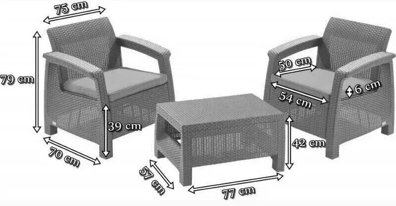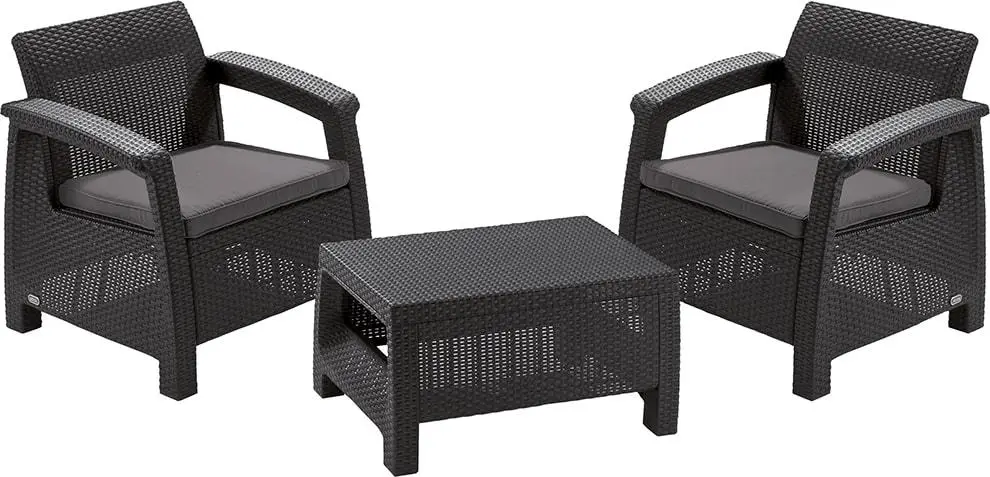 Комплект пластикових меблів Keter Corfu II Weekend для балкона складається з двох крісел з м'якими подушками і кавового столика. Підходить для використання в ресторанах, в офісах, на курортах, зонах відпочинку, в готелях, а також в котеджах або заміських будинках.