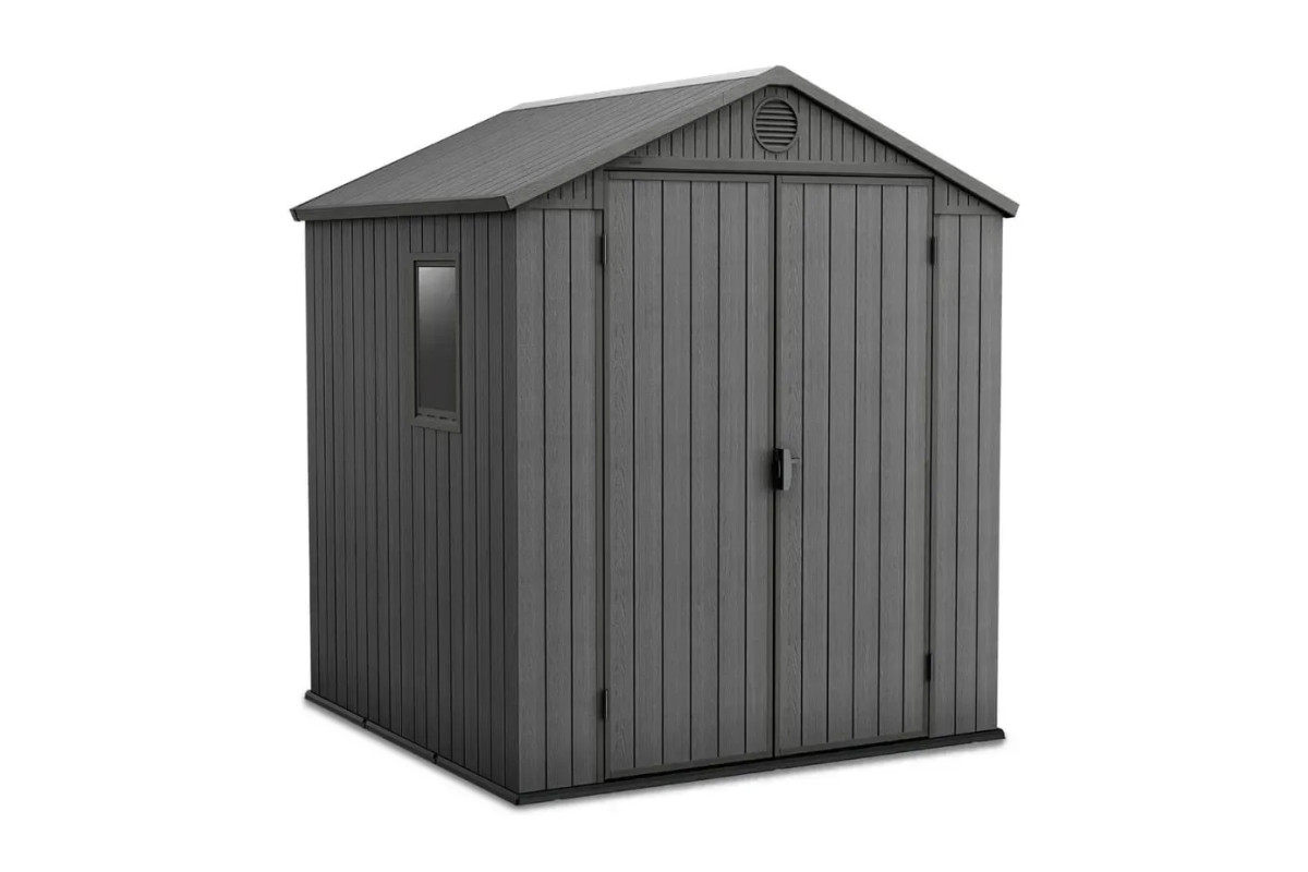 Садовий пластиковий будиночок Keter Darwin 6 х 6 (190 х 182 см) — це компактний, але місткий садовий будиночок, який забезпечує надійне зберігання інструментів, інвентарю та садової техніки. Завдяки високій стелі та широким двостулковим дверям він зручний у використанні, а природне освітлення та вентиляція роблять його практичним навіть для тривалого перебування всередині.