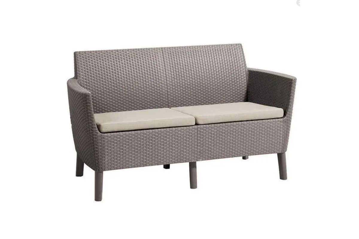 Диван садовий Keter Salemo — це сучасний двомісний садовий диван із обтічною формою та фактурою, що імітує натуральний ротанг. Він поєднує стильний дизайн із комфортом завдяки широкому сидінню та товстим подушкам, створюючи ідеальне місце для відпочинку на терасі, балконі чи в саду.