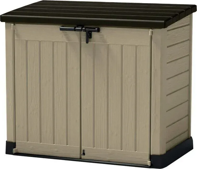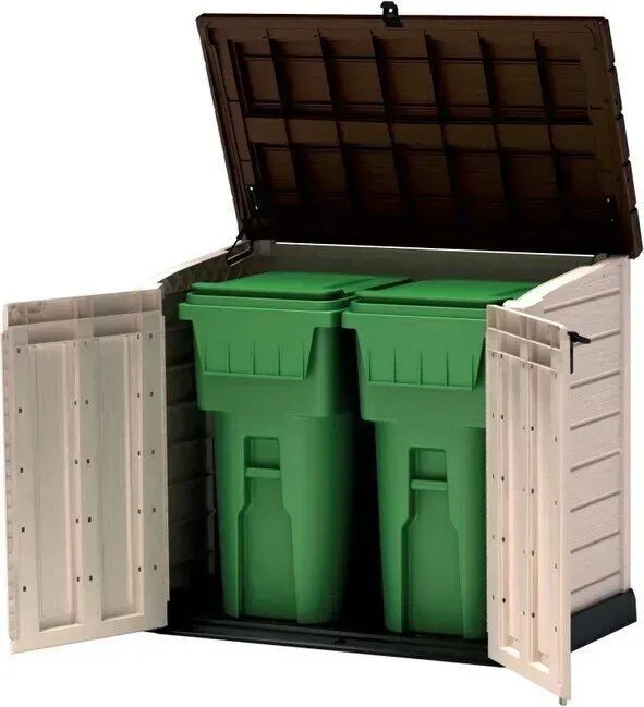 Відкидна кришка та подвійні двері забезпечують зручний доступ, а похилий поріг полегшує закочування великих предметів. Конструкція стійка до атмосферних впливів, легко збирається та не потребує спеціального догляду.