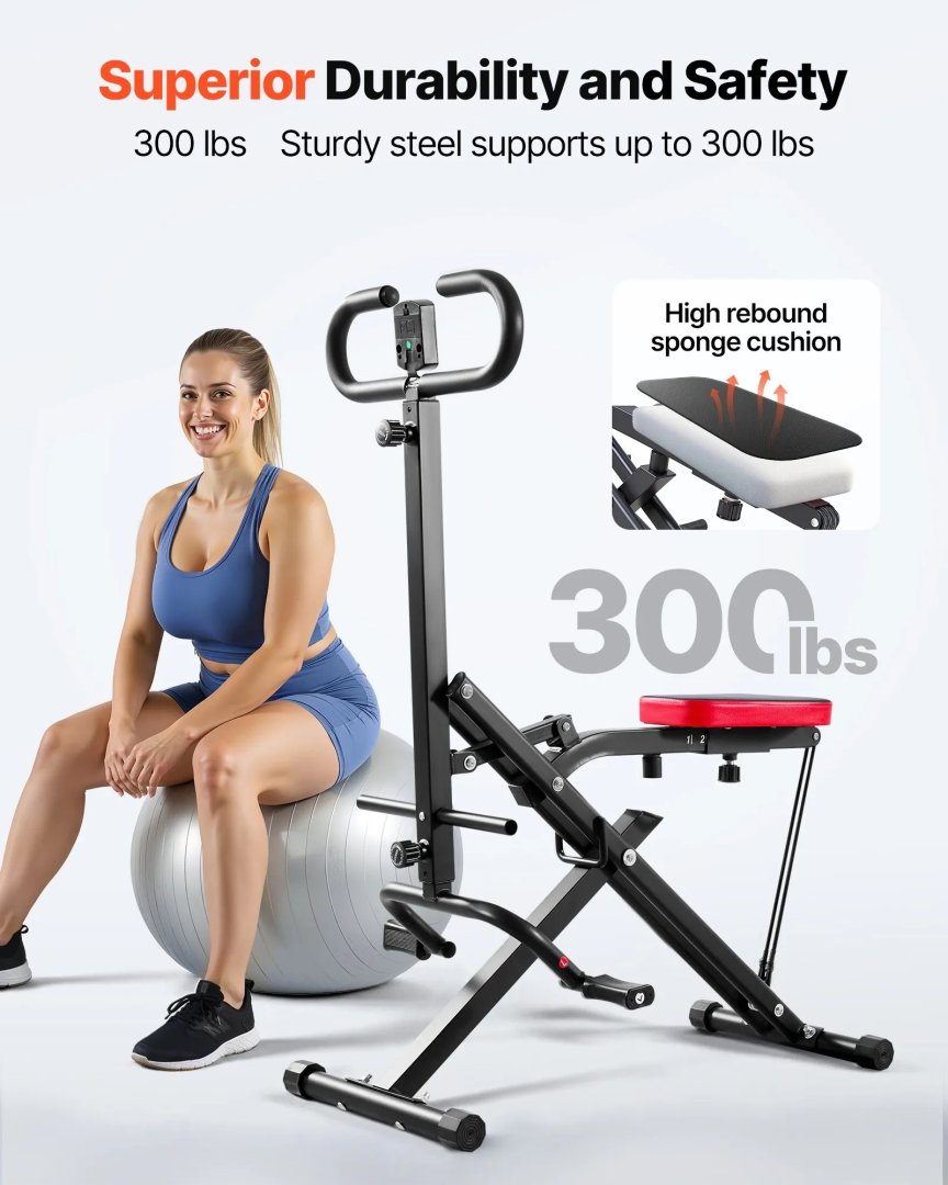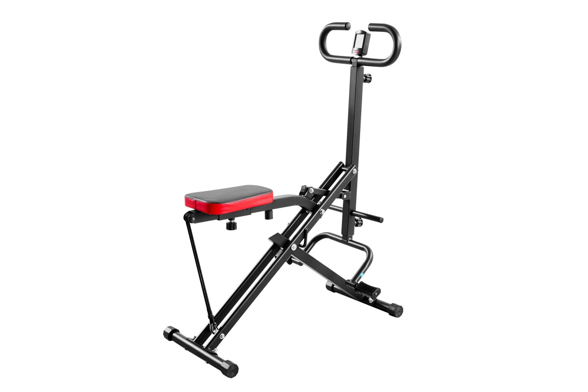 - М'яке сидіння та спинка з опорою підтримують хребет у прямій лінії, забезпечуючи контрольовані присідання, задіюючи, зокрема, сідниці, чотириголові м'язи та підколінні сухожилля.
