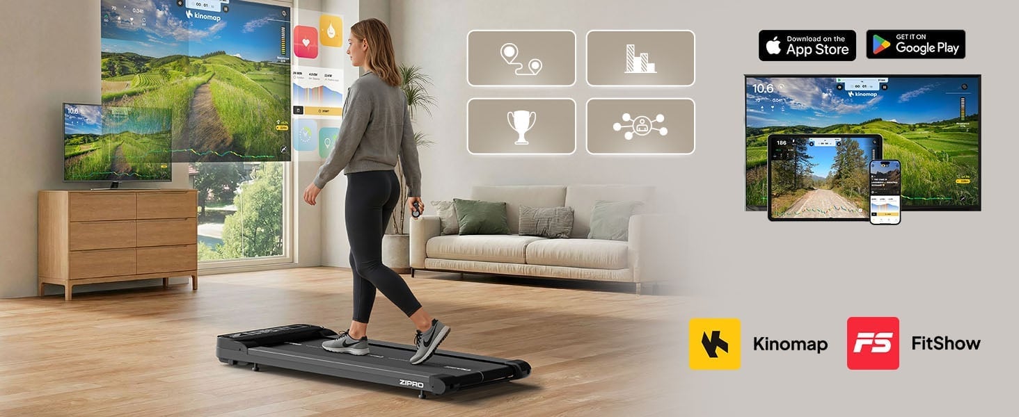 Якщо ви увімкнете додатки FitShow або Kinomap, ви отримаєте доступ до віртуальних маршрутів та інтерактивних тренувань. Завдяки цьому кожна прогулянка на ZIPRO Catwalk стає викликом, який мотивує до регулярної активності та робить домашнє тренування ще цікавішим.