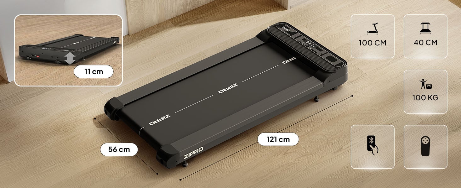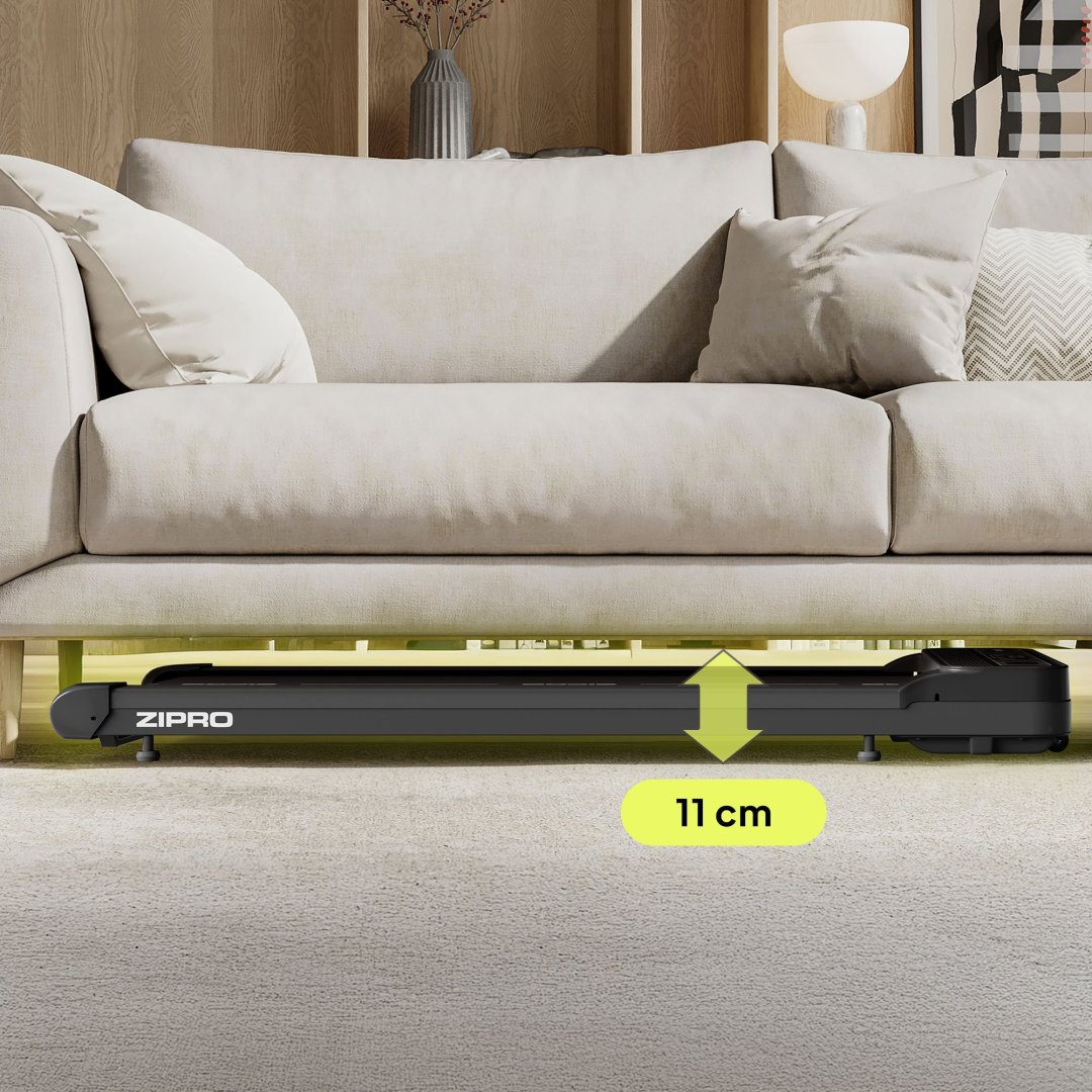 Завдяки висоті всього 11 см, ZIPRO Catwalk можна сховати під ліжко або інший предмет меблів, що дозволяє зберігати бігову доріжку в горизонтальному положенні та економити цінний простір у домі. Компактна конструкція робить тренування вдома не таким вимогливим до площі.