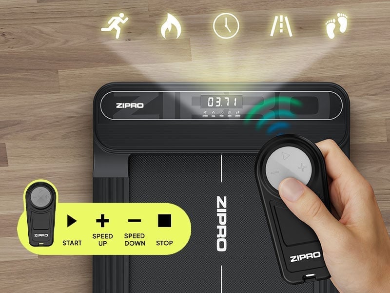 Керування біговою доріжкою ZIPRO Catwalk просте та зручне. Пульт дистанційного керування дозволяє в будь-який момент змінювати швидкість, а також вмикати та вимикати пристрій, не перериваючи тренування. Зручний LED-дисплей показує ключові параметри: швидкість, тривалість активності, спалені калорії та пройдену відстань, завдяки чому ви завжди маєте контроль над тренуванням.