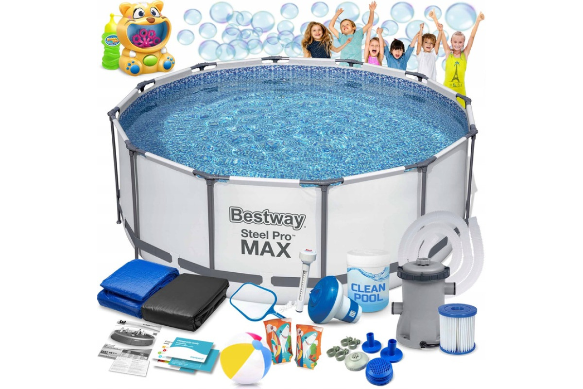 Басейн каркасний 17в1 Bestway 56595 427 × 84 см з машинкою для мильних бульбашок — це сучасне рішення для сімейного відпочинку. Простора чаша дозволяє вільно плавати, а міцна конструкція та повний набір аксесуарів роблять його готовим до використання одразу після встановлення. У комплекті — машинка для мильних бульбашок із рідиною.