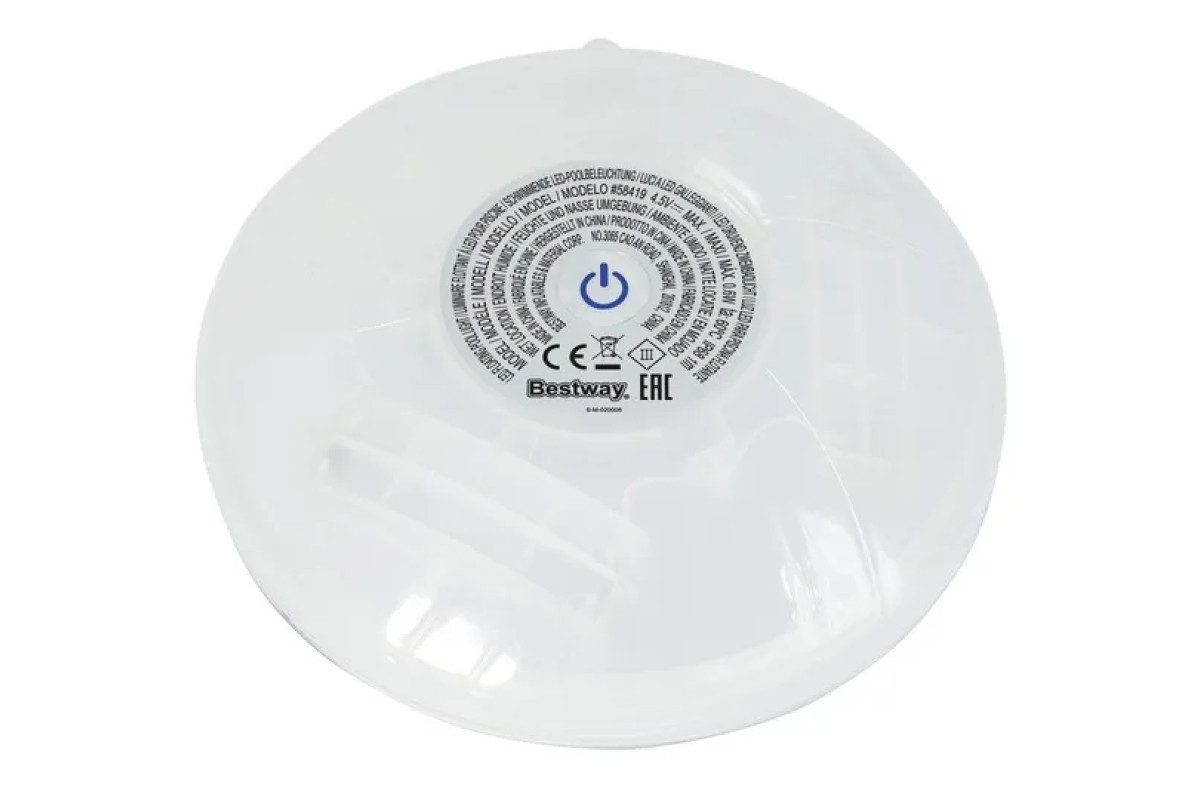 Світильник для басейну Bestway 58419 — це плаваюча світлодіодна лампа для басейну, яка створює атмосферне освітлення завдяки 4 кольорам та 7 режимам роботи. Вона повністю водонепроникна (IP68), працює на батарейках AA до 8 годин та легко керується однією кнопкою.