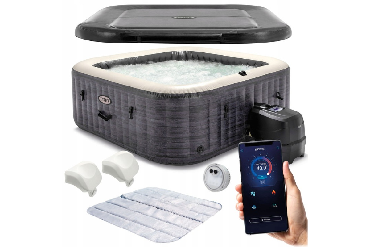 Керування СПА можливе через мобільний додаток Intex Spa для Android та iOS, який дозволяє запускати режим масажу, контролювати температуру води та активувати фільтрувальний насос. Сучасна електронна панель керування з чітким дисплеєм працює в діапазоні від 10 до 40 °C, забезпечуючи повний контроль над функціями.