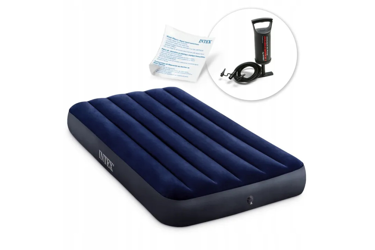 У комплект входить ручна поршнева помпа, яка дає можливість швидко надути матрац без додаткових витрат, а також латка для ремонту, що допоможе усунути дрібні пошкодження. Завдяки компактності у складеному вигляді його зручно брати із собою у подорожі, кемпінг чи на відпочинок.