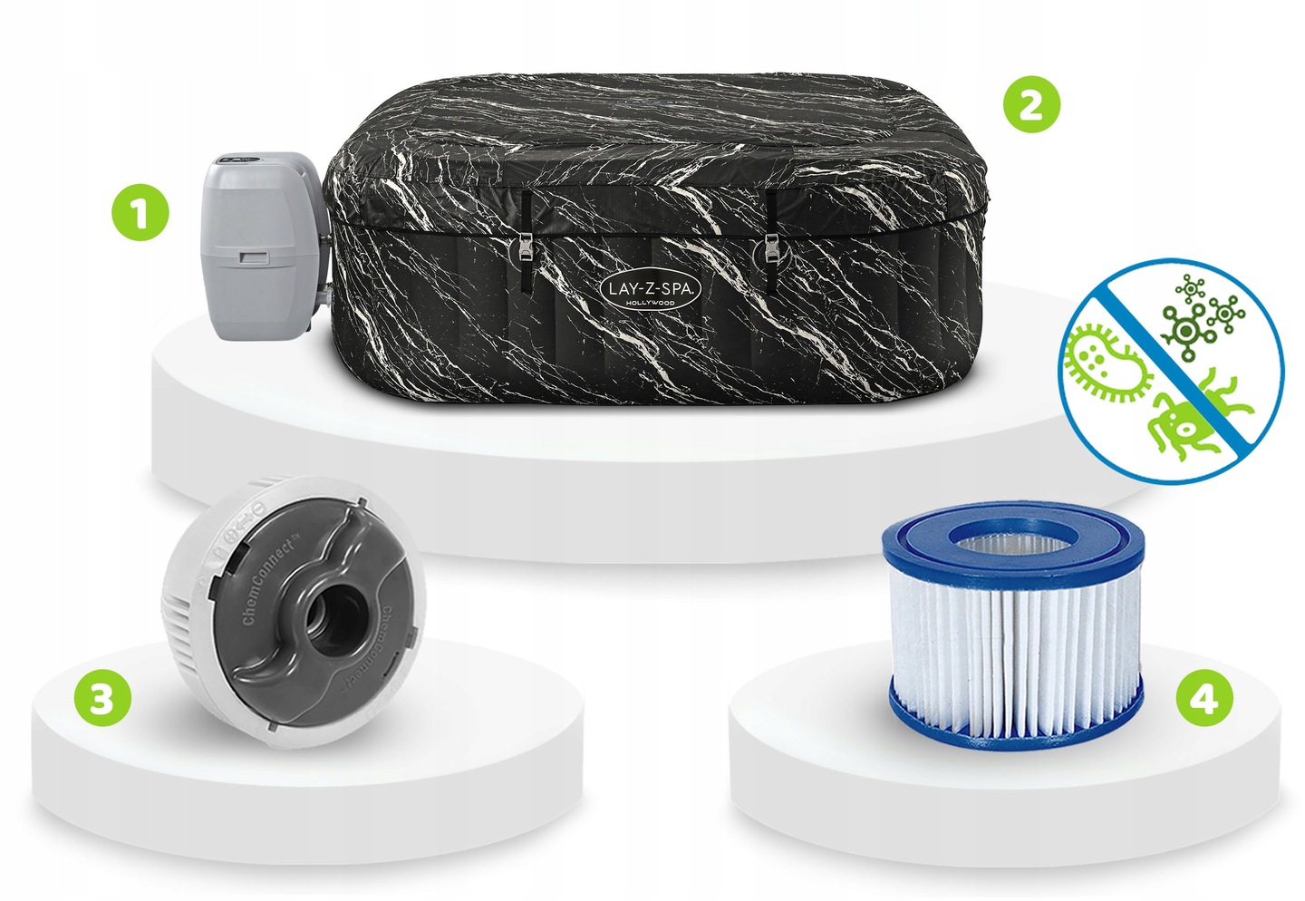 - Система фільтрації — помпа, покриття, дозатор ChemConnect та якісний фільтр підтримують чистоту води.