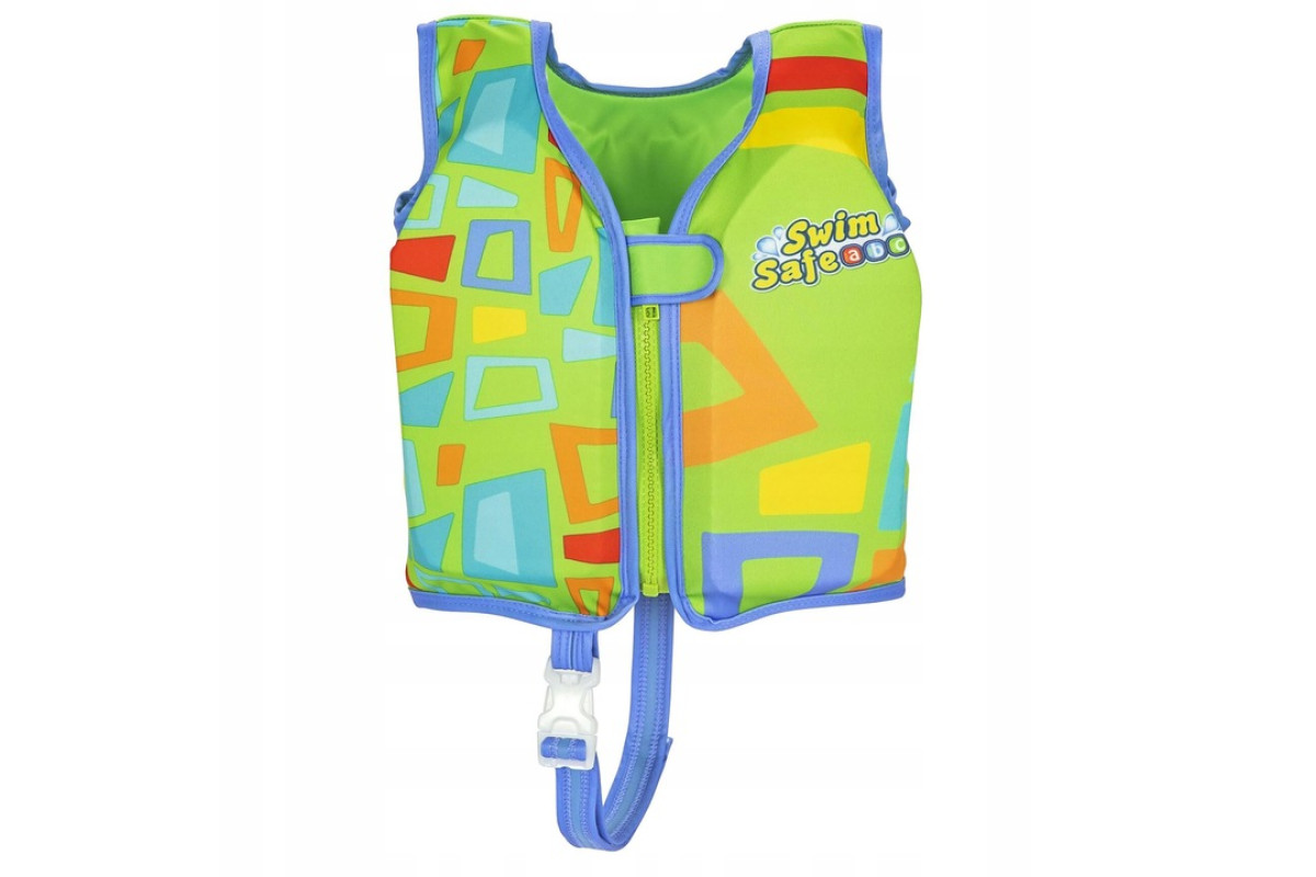 Жилет оснащений регульованими застібками та поясом, що дозволяє підлаштувати його під дитину та забезпечити надійну посадку. Він виготовлений із міцного матеріалу, стійкого до пошкоджень, та має захист від ультрафіолету UPF 50+, що додатково оберігає ніжну шкіру від сонця. Модель не є рятувальним обладнанням, але чудово підходить для навчання плаванню під наглядом дорослих. Легка вага робить його зручним для транспортування та використання на пляжі чи в басейні.