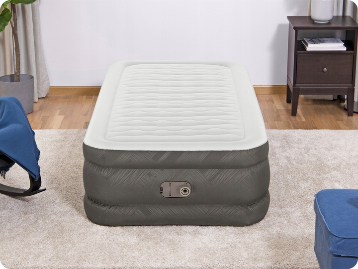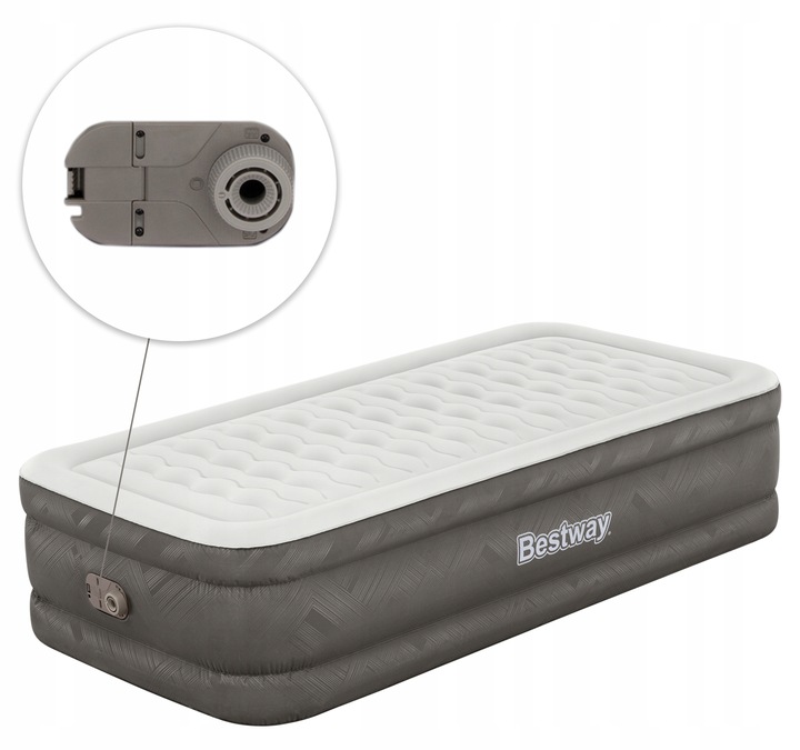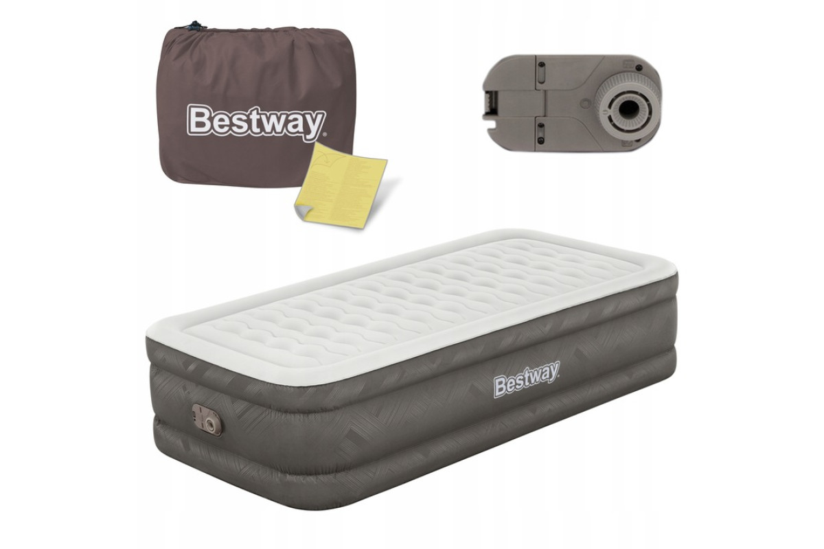 Надувний матрац Bestway 69048 із вбудованою електричною помпою — це практичний односпальний матрац розміром 191 × 97 × 46 см, яке поєднує комфорт, сучасні технології та зручність у використанні. Висота 46 см створює відчуття справжнього ліжка, забезпечує стабільність і комфортний сон, а міцний матеріал ПВХ у поєднанні з поліестером гарантує довговічність та стійкість до пошкоджень. Завдяки технології Wave-Beam матрац має внутрішній каркас, що рівномірно розподіляє навантаження та підтримує тіло під час відпочинку.