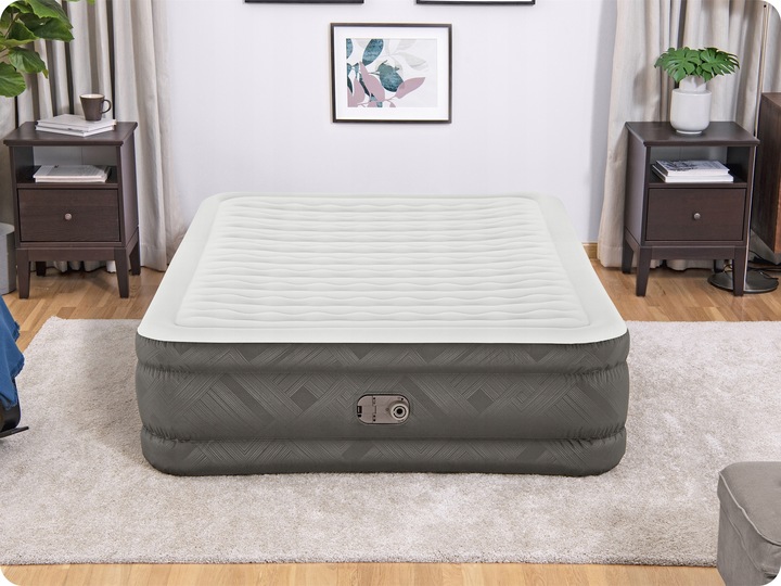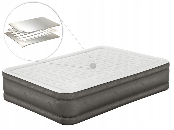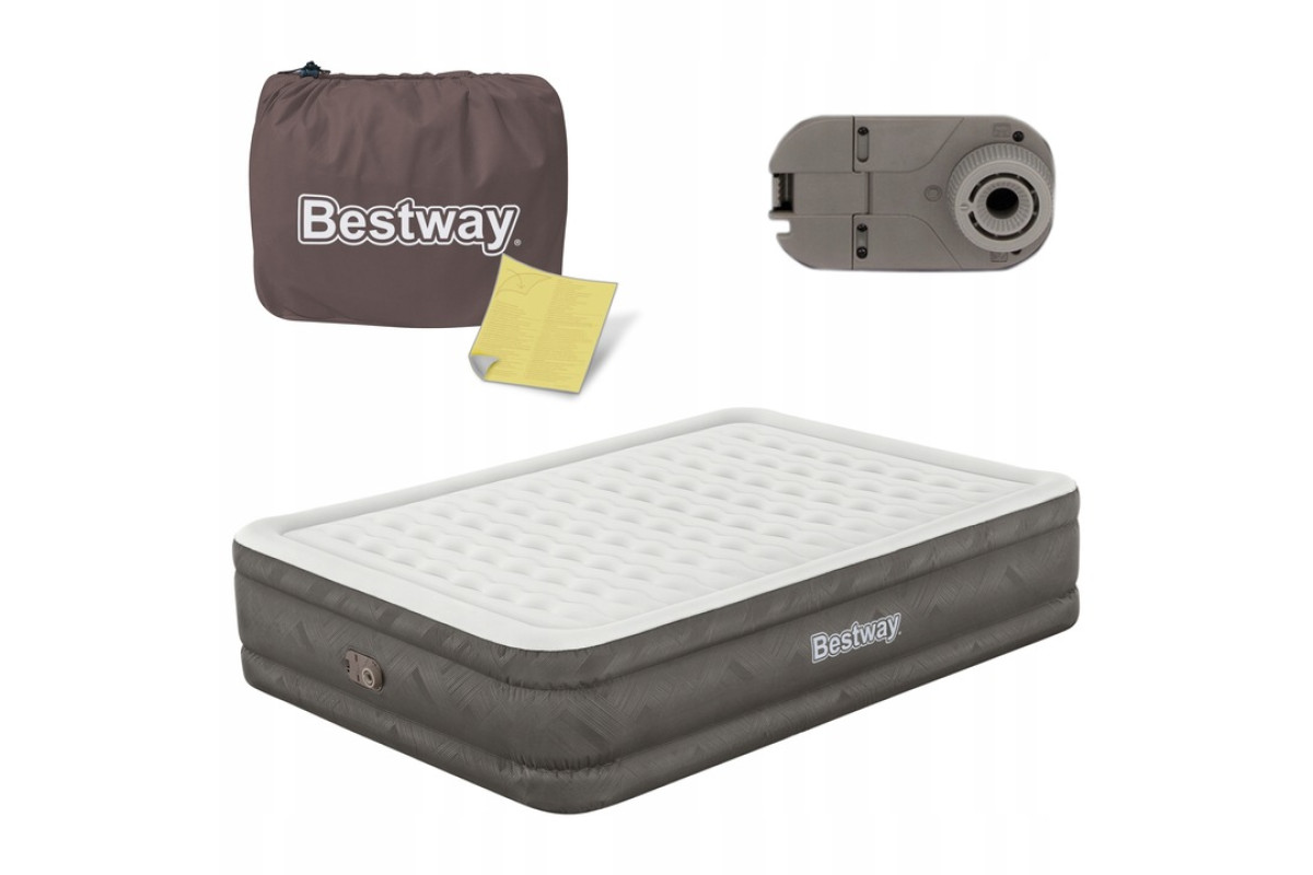 Вбудована електрична помпа (220–240 V) дозволяє швидко надути матрац за 3–4 хвилини, а клапан швидкого спуску повітря робить процес збирання простим і зручним. У комплект входить сумка для транспортування та ремонтна латка, що додає практичності у використанні. Це ідеальне рішення для дому, дачі чи подорожей, коли потрібне комфортне та мобільне спальне місце для двох осіб.