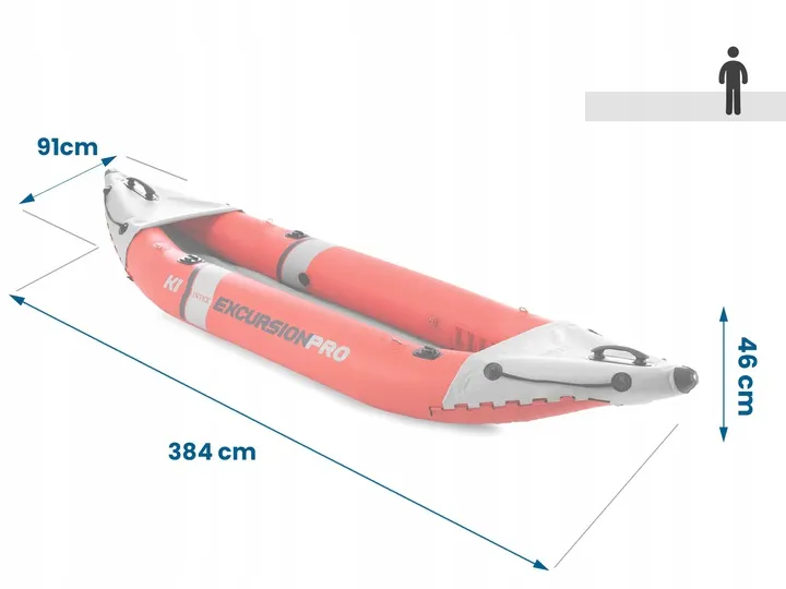 Каяк надувний Intex Excursion Pro K1 – це міцний одномісний надувний каяк, створений для активного відпочинку та риболовлі. Завдяки розмірам 305 × 91 × 46 см він забезпечує комфортне місце для одного користувача, а вантажопідйомність до 100 кг робить його практичним для різних умов використання. Корпус виготовлений із тришарового вінілового матеріалу (PVC) з поліестровим покриттям, що стійкий до сонця та солоної води, а дві незалежні повітряні камери гарантують безпеку навіть у випадку пошкодження.