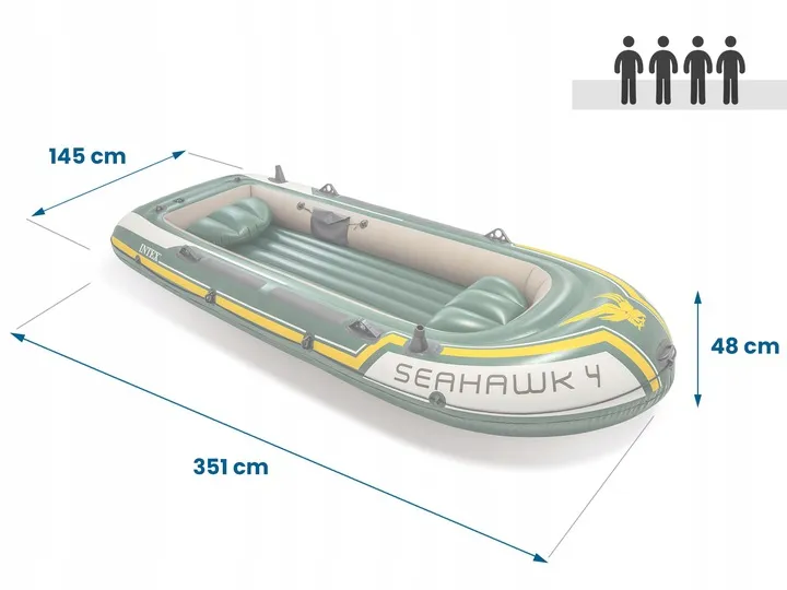 Човен надувний Intex Seahawk 4 315 x 145 x 48 см – великий надувний човен, який поєднує комфорт, безпеку та практичність. Завдяки розмірам 351 × 145 × 48 см та вантажопідйомності до 480 кг, він забезпечує простір для чотирьох осіб і чудово підходить як для риболовлі, так і для сімейних прогулянок чи активного відпочинку на воді. Виконаний із міцного ПВХ товщиною 0,75 мм, човен має три незалежні повітряні камери та додаткову камеру в корпусі, що гарантує стабільність і довговічність.