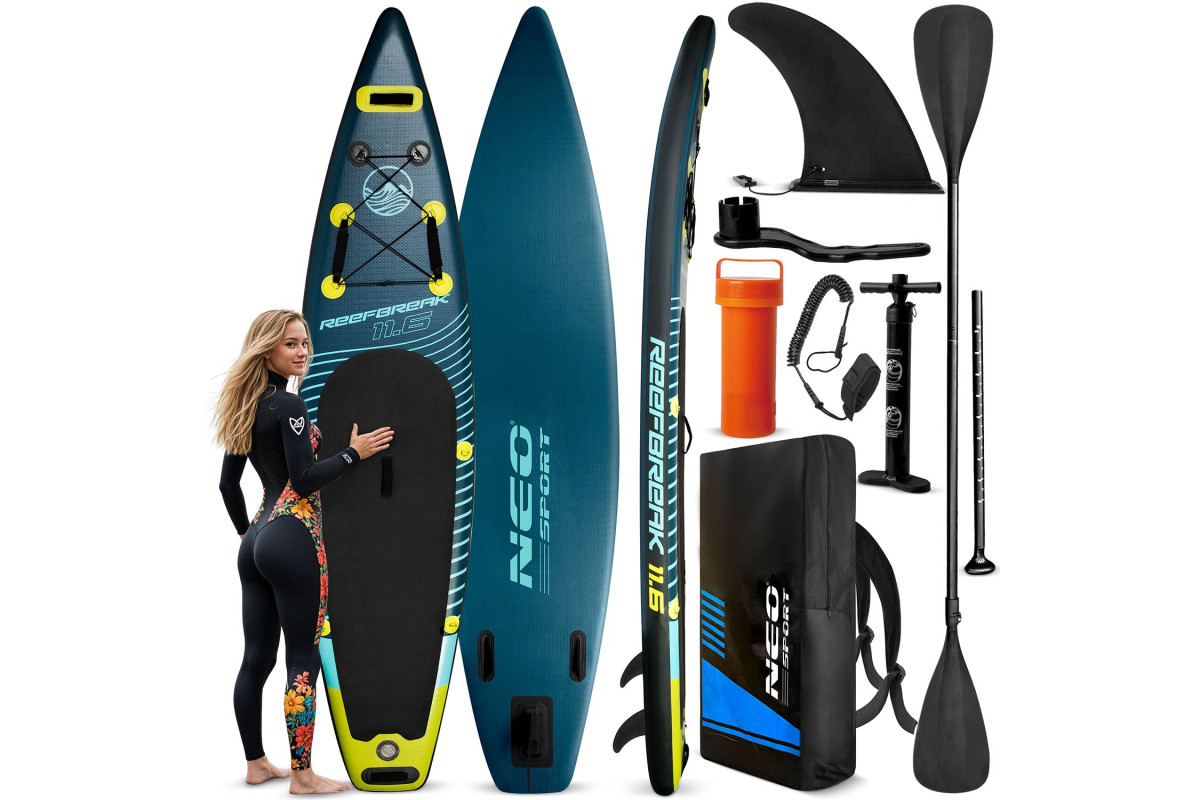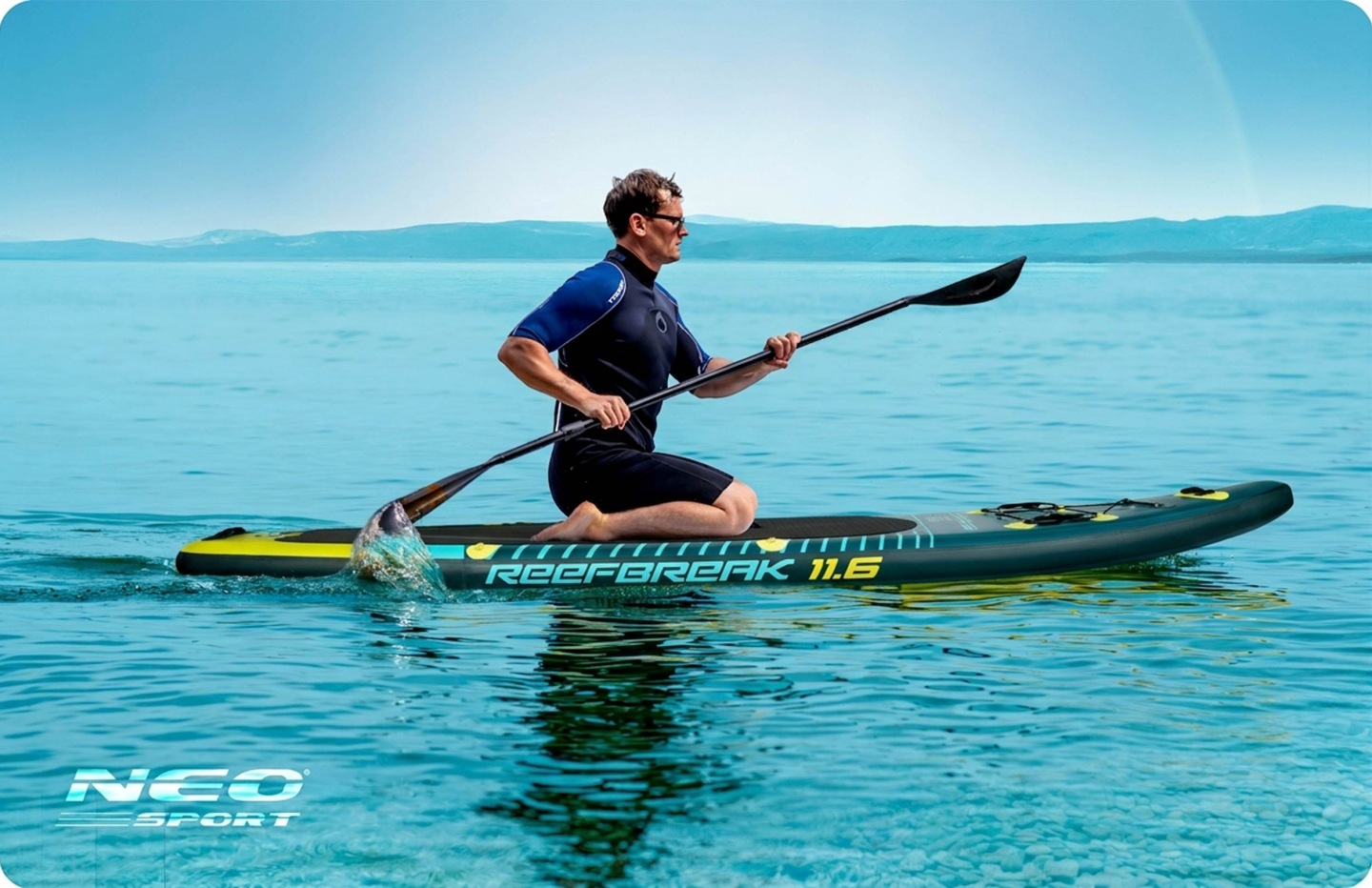 У комплект входить усе необхідне для старту: регульоване алюмінієве весло, двостороння помпа з манометром, рюкзак для транспортування, страхувальний смис, ремкомплект та еластична сітка для багажу. Reefbreak Neo-Sport — це практичне й готове до використання рішення, яке не потребує додаткових витрат чи складних налаштувань.
