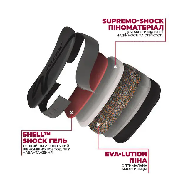 - Подвійна амортизація – гелева підкладка Shell-Shock™ та піна Supremo-Shock Foam™ для максимального поглинання ударів.