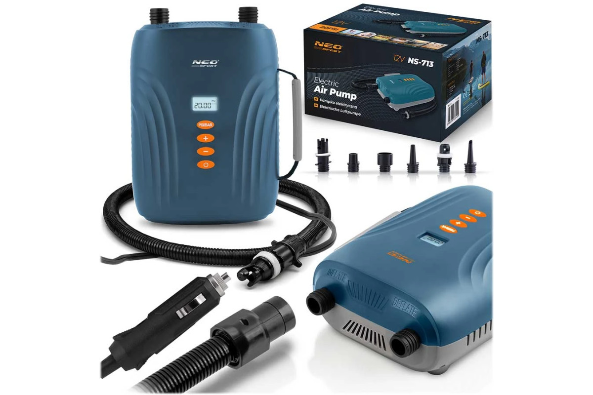 Насос електричний для надувного човна SUP Neo-Sport NS-713 працює від автомобільного прикурювача (12V), тому її легко використовувати під час подорожей, кемпінгу чи відпочинку біля водойм. Завдяки системі Double Motor забезпечується двоступеневе накачування: спочатку швидке заповнення великою кількістю повітря, а потім точне доведення до потрібного тиску. Максимальний тиск становить 20 PSI, що дозволяє без зусиль підготувати спорядження навіть для професійного використання.