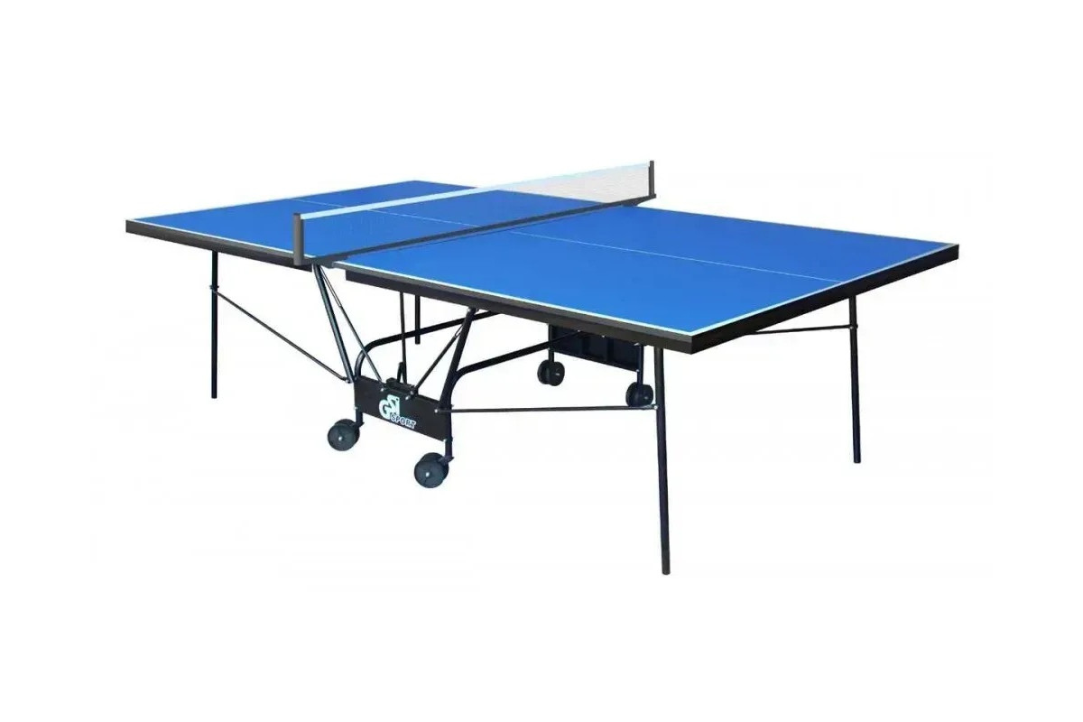 Тенісний стіл для закритих приміщень забезпечує високу якість гри завдяки спеціально обробленій древесностружечній плиті (ДСП) товщиною 16 мм, що покрита антибліковим пластиковим покриттям синього кольору. Ігрова поверхня оснащена металевою рамою з прямокутного профілю 30*20 мм, що забезпечує додаткову міцність. Основою конструкції є компактний і зручний візок, виготовлений з металевого трубчастого профілю діаметром 25 мм з поліефірним покриттям. Стіл дозволяє тренуватися в поодинці і легко переміщується завдяки 4 здвоєним колесам діаметром 107 мм, з яких 2 колеса маневрені.