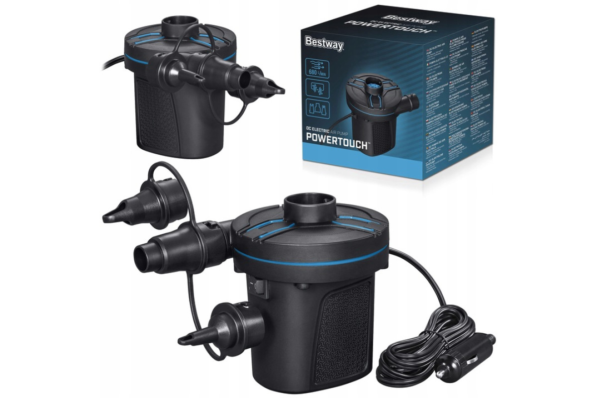 Насос електричний Bestway PowerTouch 62257 — це компактний і потужний насос, який працює від автомобільного прикурювача 12 V. Він призначений для швидкого накачування та спуску надувних виробів Bestway (матраци, басейни, кола, човни тощо).