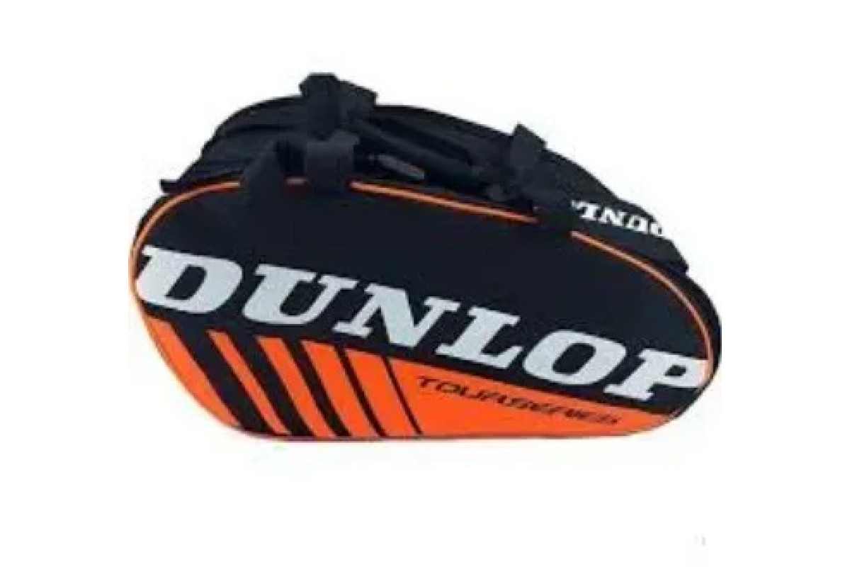 Це практична сумка для паделу від бренду Dunlop, створена для гравців, яким потрібно зручно переносити ракетку та базове спорядження на тренування або матчі. Має компактний середній розмір і простий спортивний дизайн у чорному кольорі з помаранчевими вставками.