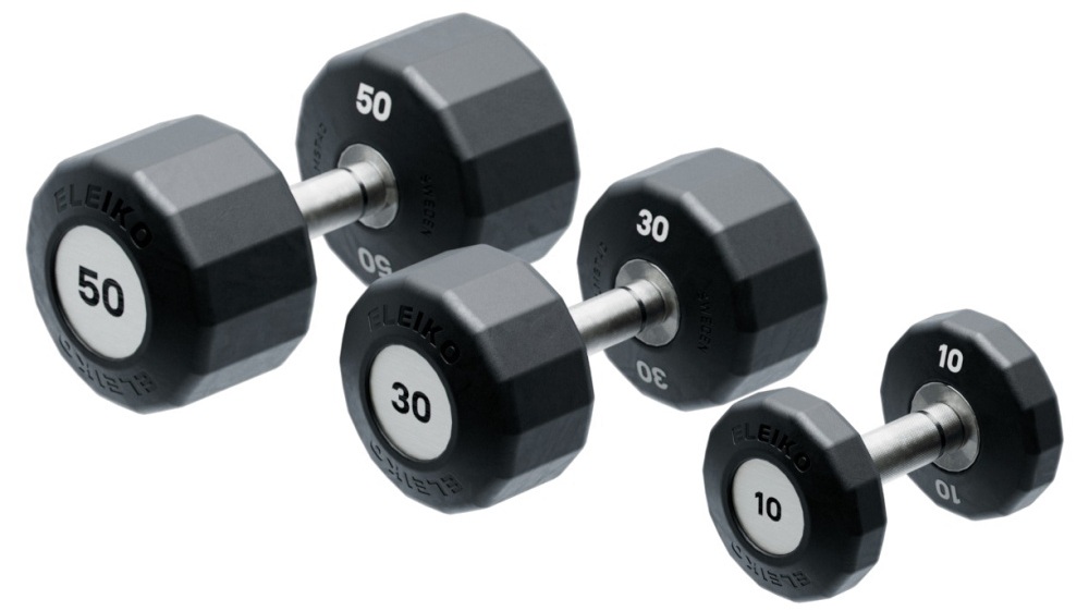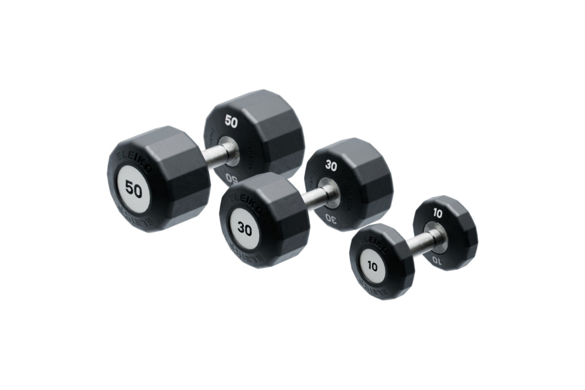 Діапазон ваг. Доступний повний діапазон гантелей Eleiko Evo від 1 до 60 кг, а функція обертання починається з 5 кг. Легші гантелі мають таке саме рифлення (накатку) та візуальний дизайн, створюючи єдиний, цілісний вигляд набору.
