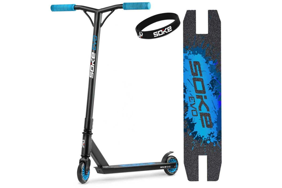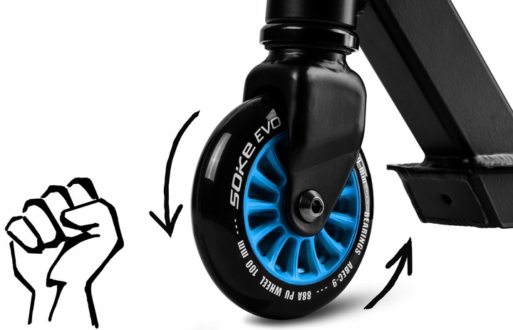 Самокат SOKE EVO Blue — це трюковий самокат, який поєднує легкість, міцність та сучасний дизайн. Завдяки вазі лише близько 3,4 кг він маневрений і слухняний, що робить його чудовим вибором для тих, хто хоче впевнено відпрацьовувати трюки у скейтпарку чи на міських вулицях. Одночастинний алюмінієвий дек (48 × 10 см) витримує серйозні навантаження, а залізна вилка та кермова труба додають міцності й контролю. Система компресії HIC забезпечує плавність руху та стабільність, а колеса PU 100 × 24 мм з твердістю 88A гарантують швидкість і точність.