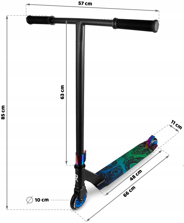 - Легка вага (3,45 кг) дозволяє легко контролювати самокат під час трюків.