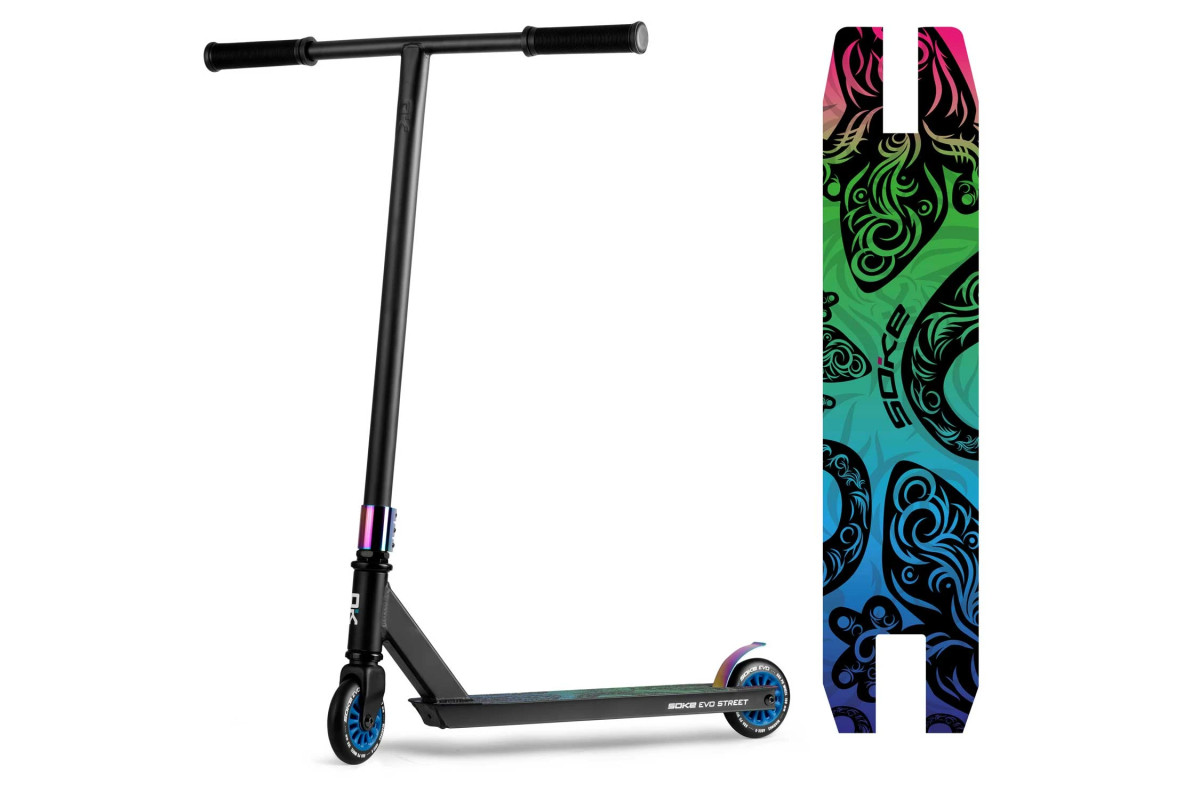 Самокат SOKE EVO Street Black — це надійний трюковий самокат, створений для тих, хто хоче відчувати свободу руху та впевненість у кожному трюку. Одночастинний алюмінієвий дек (48 × 10 см) з якісними зварними швами витримує серйозні навантаження, а сталева кермова труба додає міцності та контролю. Завдяки вазі лише 3,45 кг він залишається маневреним і слухняним навіть під час швидких розворотів. Система компресії HIC забезпечує плавність руху та стабільність, а колеса PU 100 × 24 мм з нейлоновим сердечником гарантують швидкість і контроль.