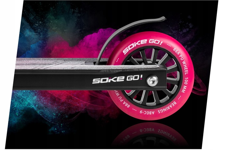 Самокат SOKE GO! — легкий і маневрений трюковий самокат, створений для катання у скейтпарку та відпрацювання трюків. Одночастинний алюмінієвий дек (48 × 10 см) з якісними зварними швами витримує серйозні навантаження, а сталева кермова труба забезпечує міцність і контроль. Завдяки вазі лише 2,9 кг він ідеально підходить для швидких розворотів і складних елементів. Система компресії HIC гарантує плавність руху та стабільність, а колеса PU 100 × 24 мм з нейлоновим сердечником забезпечують швидкість і контроль.