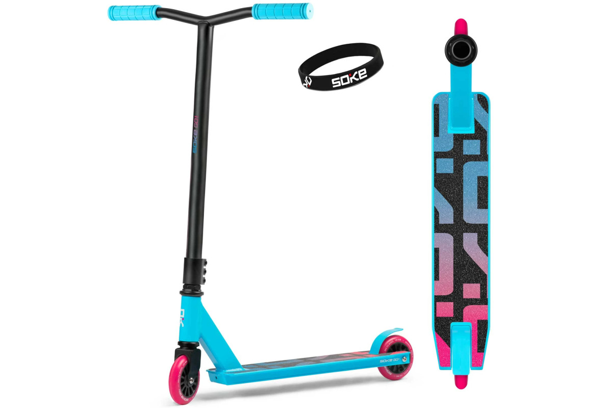 Самокат SOKE GO! — легкий і маневрений трюковий самокат, створений для катання у скейтпарку та відпрацювання трюків. Одночастинний алюмінієвий дек (48 × 10 см) з якісними зварними швами витримує серйозні навантаження, а сталева кермова труба забезпечує міцність і контроль. Завдяки вазі лише 2,9 кг він ідеально підходить для швидких розворотів і складних елементів. Система компресії HIC гарантує плавність руху та стабільність, а колеса PU 100 × 24 мм з нейлоновим сердечником забезпечують швидкість і контроль.