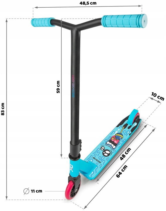 Ця модель витримує навантаження до 100 кг і підходить як для початківців, так і для досвідчених райдерів. Широке кермо Y‑BAR (48,5 см) з м’якими грипами TPR забезпечує комфортний хват, а яскравий бірюзовий дизайн додає сучасного вигляду.