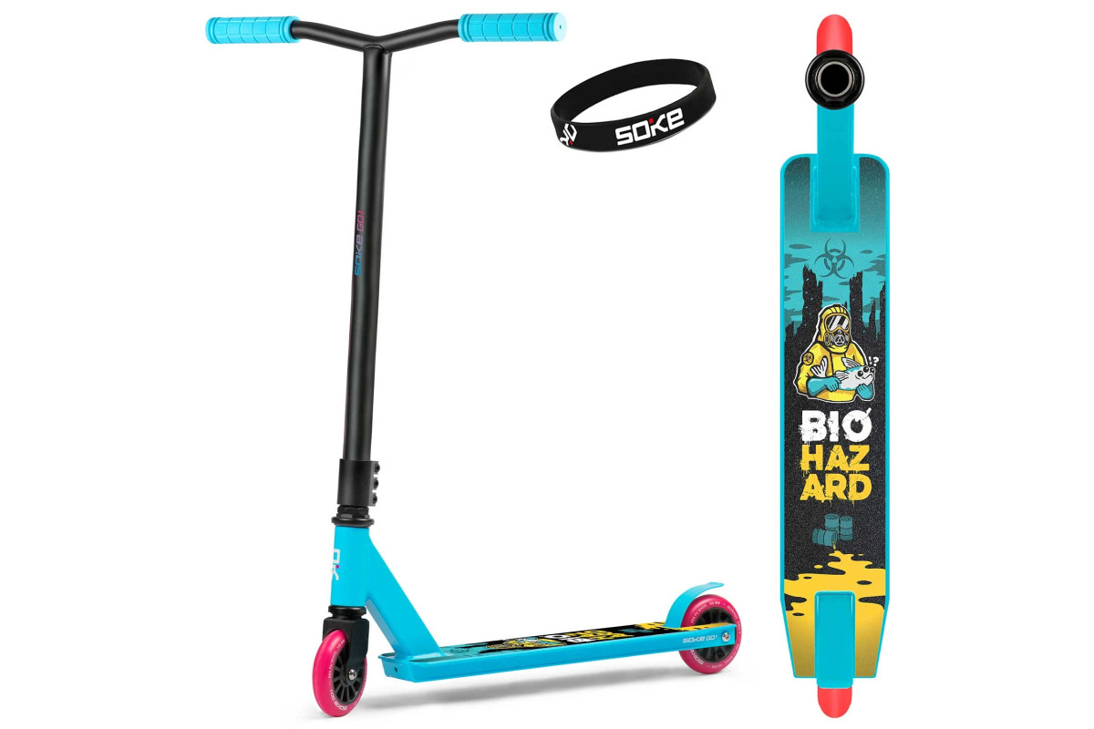 Самокат SOKE GO! — легкий і маневрений трюковий самокат, створений для катання у скейтпарку та відпрацювання трюків. Одночастинний алюмінієвий дек (48 × 10 см) з якісними зварними швами витримує серйозні навантаження, а сталева кермова труба забезпечує міцність і контроль. Завдяки вазі лише 2,9 кг він ідеально підходить для швидких розворотів і складних елементів. Система компресії HIC гарантує плавність руху та стабільність, а колеса PU 100 × 24 мм з нейлоновим сердечником забезпечують швидкість і контроль.