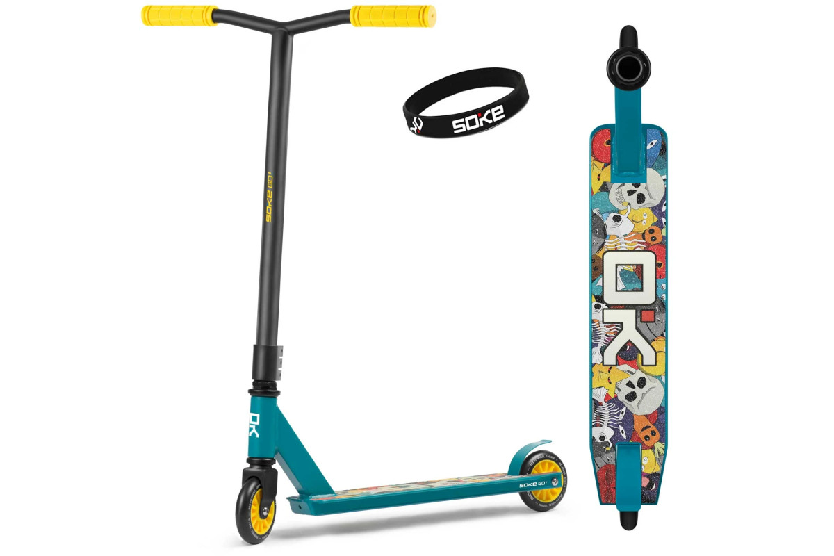 Самокат SOKE GO — це трюковий самокат, який поєднує легкість, міцність та стильний дизайн. Завдяки вазі лише 2,9 кг він надзвичайно маневрений і слухняний, що робить його чудовим вибором для тих, хто хоче впевнено відпрацьовувати трюки у скейтпарку чи на міських вулицях. Одночастинний алюмінієвий дек (48 × 10 см) витримує серйозні навантаження, а залізна вилка та кермова труба додають міцності й контролю. Система компресії HIC забезпечує плавність руху та стабільність, а колеса PU 100 × 24 мм з нейлоновим сердечником гарантують швидкість і точність.